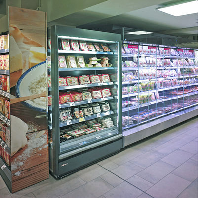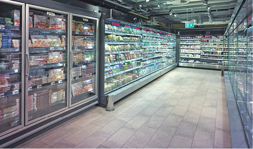 Auch am Point of Sale wartet der neue Hit-Ullrich-Markt in Berlin Charlotten-burg mit einer ganzen Reihe Besonder-heiten an Kühl- und Tiefkühltechnik auf: Auf einer Fläche von 55 m 2 präsentieren Filialleiter Arne Christensen und sein Team Milch-Produkte sowie Fleisch- und Wurstwaren in 21 Leho-Kühlschrank-Modulen von Viessmann, die mit sogenannten Smart-Access-Türen ausgestattet sind. Diese öffnen sich berührungslos. Es reicht aus, dass der Kunde mit der Hand zur Tür hin greift. Mit den Tiefkühlschränken Luxo (zwei Module), dem aus Truhe und Schrank bestehenden Tiefkühlset Nardo (drei Module), einer 15 m langen Bedientheke vom Typ Perseus und dem Kühlregal Novus sind weitere Kühl- und Tiefkühlmöbel von Viessmann im Einsatz. Alle Komponenten sind an die transkritische CO 2 -Anlage von Teko angeschlossen. Getränke und Convenience-Produkte präsentiert der Hit-Ullrich-Markt in Berlin Charlottenburg darüber hinaus in zwei steckerfertigen Euromax-Kühlregalen, Eis gibt’s aus der Norwell-Tiefkühlinsel.