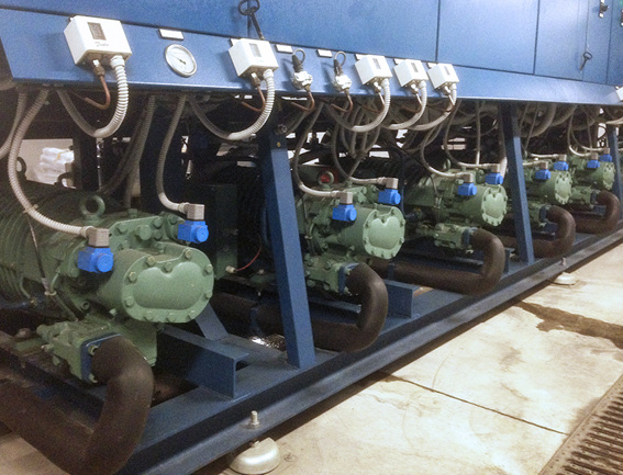 Der NK-Verbund (Bild 1) am StandortSeregno, der für das Pilotprojekt ausgewähltwurde, besteht aus sechs Schraubenverdichter (fünf Stück Bitzer HSK 6451-50, einStück Bitzer HSK 7471-90) und versorgt 73Kühlregale und sieben Kühlräume. Außerdem umfasst er einen kleinen Kühlkreislaufmit TEV zur Kühlung des Elektro-Schaltschranks, der den Frequenzumrichter be-herbergt, einen Plattenwärmeübertrager als Economizer (Unterkühleinheit) sowie einen Wärmeübertrager zur Wärmerückgewinnung. Alle Kühlregale und Kühlräume sowie die beiden Plattenwärmeübertrager, die die CO2-Kaskade anbinden, verfügen über elektronische Expansionsventile (EEV, insgesamt 80) und werden mit einem ADAP-KOOL Controller (EKC414A) von Danfoss geregelt. Der Ausgang des Economizers geht direkt in die Zwischenkühlung der Verdichter. Ein weiterer (dritter) Plattenwärmeübertrager befindet sich im CO2-Kreislauf und wird von einem kleinen, unabhängigen R 404 A-System gekühlt. Daher konnte der TK-Kreislauf während des Retrofits weiterbetrieben werden.