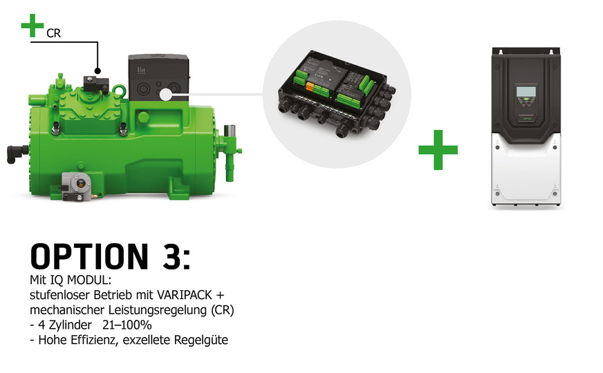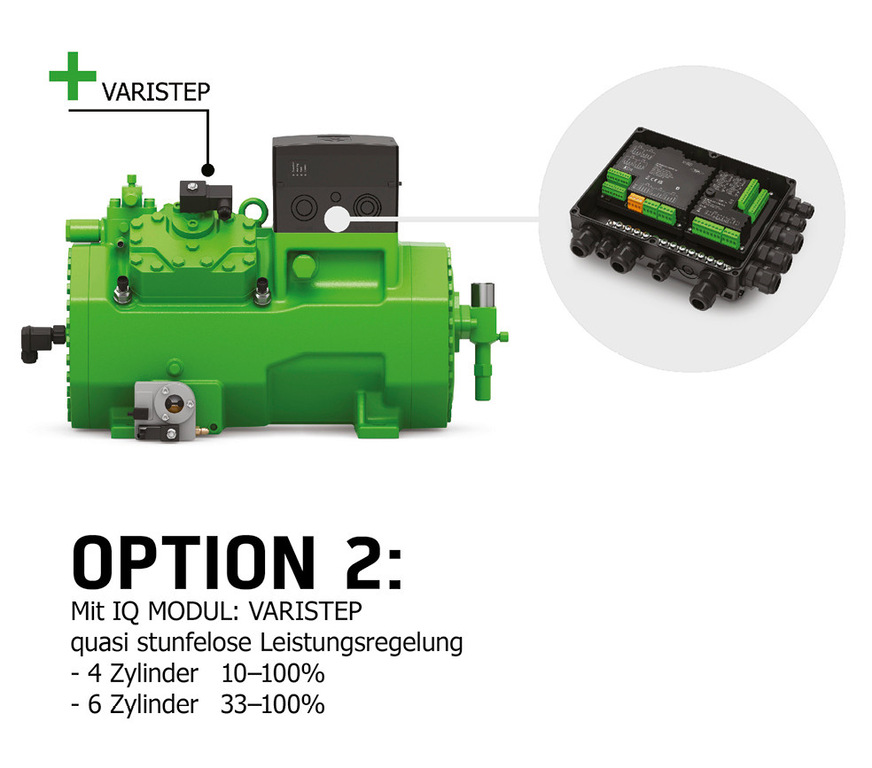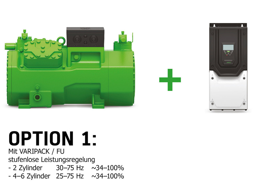 Option 3 in Bild 3 zeigt zudem, dass auch eine Kombination einer gestuften Leistungsregelung CR und Varipack möglich ist. Mithilfe des externen Frequenzumrichters ist ein übersynchroner Verdichterbetrieb bei bis zu 70 Hz möglich. 4-Zylinder-Hubkolbenverdichter können dank der gestuften Leistungsregelung CR und Varipack stufenlos zwischen 21 und 100 Prozent betrieben und die minimale Leistungsabgabe erheblich gesenkt werden. Der breite Modulationsbereich ist energetisch bei auf saisonale Effizienz optimierten Systemen mit nur einem Verdichter besonders vorteilhaft. Bei Wärmepumpen oder Flüssigkeitskühlsätzen lassen sich so besonders hohe Jahresarbeitszahlen (SCOP, SEER, SEPR) erzielen.