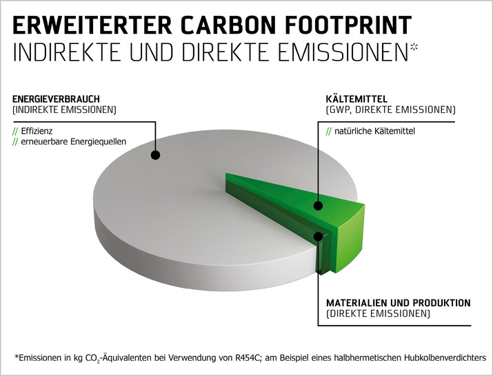 Energieeffizienz ist nicht nur im Hinblick auf die Erfüllung der Minimum Efficiency Performance Standards (MEPS)oder der zukünftigen Anforderungen der neuen EU-Verordnung für das Ökodesign nachhaltiger Produkte (ESPR) von Bedeutung. Eine Investition in die Effizienz bietet Anlagenbauern und Betreibern zahlreiche Mehrwerte, darunter reduzierte Betriebskosten und einen reduzierten Carbon Footprint durch einen geringeren Energieverbrauch. Es lohnt sich häufig auch, Bestandsanlagen einer eingehenden Prüfung zu unterziehen und gezielte Nachrüstungen vorzunehmen, da sich hier oftmals ungenutzte Effizienzpotenziale verbergen. Auch die Umwelt profitiert von energieeffizienten Anlagen. Bild 1 zeigt die Anteile direkter und indirekter Emissionen am exemplarisch berechneten Carbon Footprint eines halbhermetischen Hubkolbenverdichters bei einer Betriebsdauer von 15 Jahren mit dem Kältemittel R454C. Die Abbildung verdeutlicht, dass indirekte Emissionen durch den Energieverbrauch einen besonders hohen Anteil ausmachen. Da der Verdichter in der Regel der Hauptverbraucher in der Kälteanlage ist, lässt sich dieses Berechnungsergebnis auch auf die Gesamtanlage übertragen. Eine hohe Energieeffizienz der Anlage ist daher der entscheidende Hebel, deren Carbon Footprint zu reduzieren.
