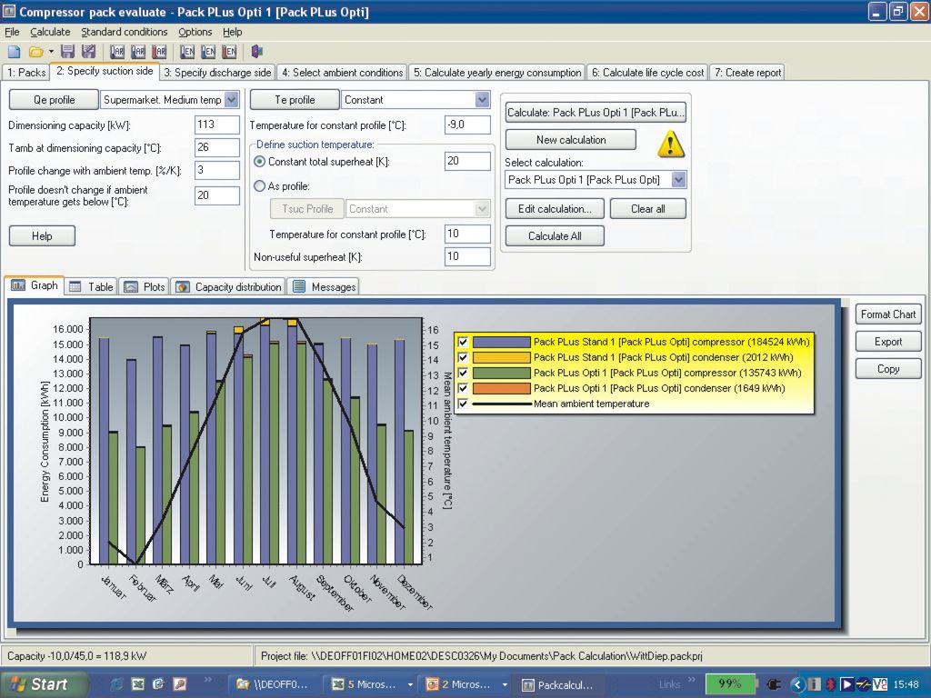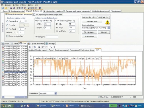 Planung von Neuanlagen mit optimiertem Energieverbrauch: Es kann aber auch für Neuanlagen, der jährliche Energieverbrauch ohne Messung, über die Wahl von Kühllastprofilen und der Verdichterdaten berechnet werden. Damit können verschiedene Szenarien der Komponentenauswahl und Betriebsbedingungen simuliert werden. Eine energetisch optimierte Kälteanlage lässt sich somit im Voraus berechnen.