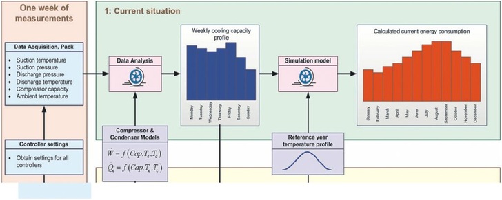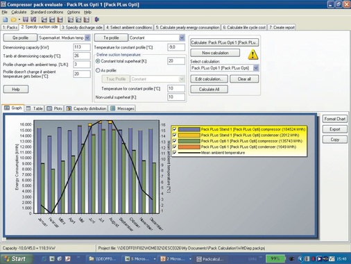 Bewertung vorhandener Anlagen: Ein Kälteanlagen-Simulationsmodell (Bild 1) berechnet über die Eingabe der Daten von einer einwöchigen Messung der Betriebstemperaturen und Schaltzeiten der Verdichter sowie der Verdichterdaten ein Kühllastprofil. Danach wird nach der Wahl des Standortes, ein Referenzjahr für die Außentemperaturdaten für die Kälteanlage festgelegt. In einem weiteren Simulationsmodell wird der jährliche Energieverbrauch berechnet.