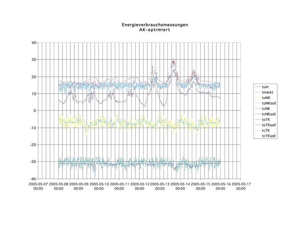 An zwei EC-Center, in der gleichen Klimazone gelegen und mit gleichen Verbundanlagen und gleicher Ausrüstung der Kühlstellen, wurden zur gleichen Zeit in den Jahren 2005 bis 2007 Vergleichsmessungen durchgeführt. Einer der Märkte ist mit einer Standard-Regelung und der andere mit einer optimierter Regelung ausgerüstet.