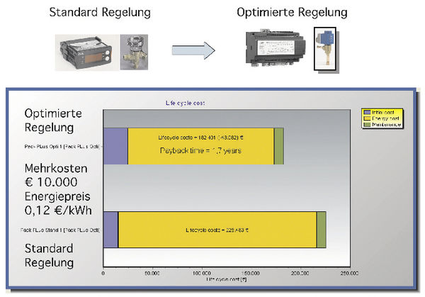 Mithilfe der Amortisationsrechnung und der Berechnung der Kosten für eine Lebensdauer von zehn Jahren, Bild 6 , ergibt sich eine eindeutige Lage für den wirtschaftlichen Einsatz dieser Regeltechnik. Die Amortisationszeit der Mehrkosten von ca.10000 Euro beträgt bei einem Zins von 4%, einer Inflation von 2% und einem Energiepreis von 0,12 Euro/kWh nur 1,7 Jahre. Über die Lebensdauer von zehn Jahren werden 43082 Euro eingespart.