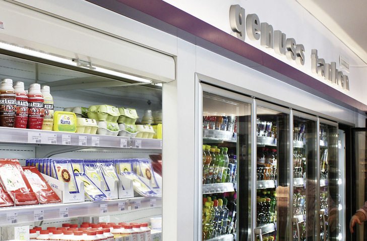Bei Laufzeiten von bis zu 18 Stunden wird die Abwärme aus den Kälteprozessen in einem Frionic-Wärmespeicher mit 3 580 Litern Inhalt gepuffert und steht flexibel sowohl für die hygienische Brauchwarmwasserbereitung, für Heizzwecke sowie für die Autowaschanlage zur Verfügung. Als Primärwärmerzeuger und Backup-System dient eine Wärmepumpe mit 90 kW Leistung. Die Autowaschanlage ist auf einen Wasserdurchsatz von 5000 Litern pro Stunde ausgelegt. Durch das Frionic-System werden im Jahr insgesamt 114245 kWh Heizenergie bzw. 10282 Euro eingespart (0,09 Cent/Liter Heizöl). Durch den Einsatz eines frequenzgeregelten Kompressors werden pro Jahr zusätzlich 25 Prozent Strom eingespart. Der CO 2 -Ausstoß wird um 33812 kg pro Jahr verringert. -