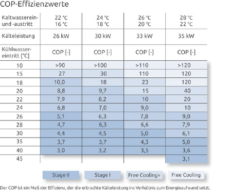 Die Maschine läuft bereits im Freikühlbetrieb, wenn die Kühlwassertemperatur nur minimal geringer ist als die geforderte Kaltwasservorlauftemperatur. In diesem Betriebsmodus werden sehr hohe Effizienzwerte (COP) von über 100 erreicht, das bedeutet, dass für das Abführen von 1 kW Abwärme weniger als 10 W elektrische Leistung notwendig ist. Die Verdichterdrehzahl und damit auch der erforderliche elektrische Energiebedarf sind direkt von der Kühlwassertemperatur abhängig. Dies bedingt, dass ab 18 °C der COP kontinuierlich sinkt. Die folgende Tabelle zeigt die COP-Effizienzwerte des eChillers