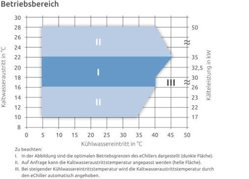 eChiller sind auf die Kühlung von Prozessen mit hohen Kaltwassertemperaturen ausgelegt. Der wirtschaftlich sinnvolle Einsatzbereich liegt bei Kaltwasseraustrittstemperaturen zwischen 16 und 22 °C. Technisch möglich sind Temperaturen von knapp über dem Gefrierpunkt bis hin zu 100 °C.
