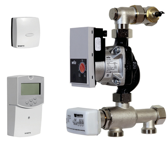 Mit Isomix bringt Watts eine montagefertige Verteilerregelstation für Flächenheizung und -kühlung heraus. Damit lassen sich auch in Gebäuden mit unterschiedlichen Wärmeträgern die jeweiligen vorgegebenen Temperaturen erzielen und Kosten sparen. Isomix-Produkte sind eine Weiterentwicklung der Verteiler-Regelstation FRG. Sie haben weniger Verschraubungen und benötigen dadurch weniger Platz bei der Montage. Die Regelstation Isomix-HC ermöglicht eine witterungsgeführte Vorlauftemperaturregelung für Flächenheizungen/-kühlungen bis circa 14 kW Leistungsbedarf. Ausgestattet ist sie mit einer 130 mm Umwälzpumpe, Mischventll mit Dreipunkt - Stellantrieb, Temperaturbegrenzer, vollelektronischem Klimaregler „ClimaticControl-HC“ (CC-HC) sowie Außentemperatur- und Vorlauftemperaturfühler.