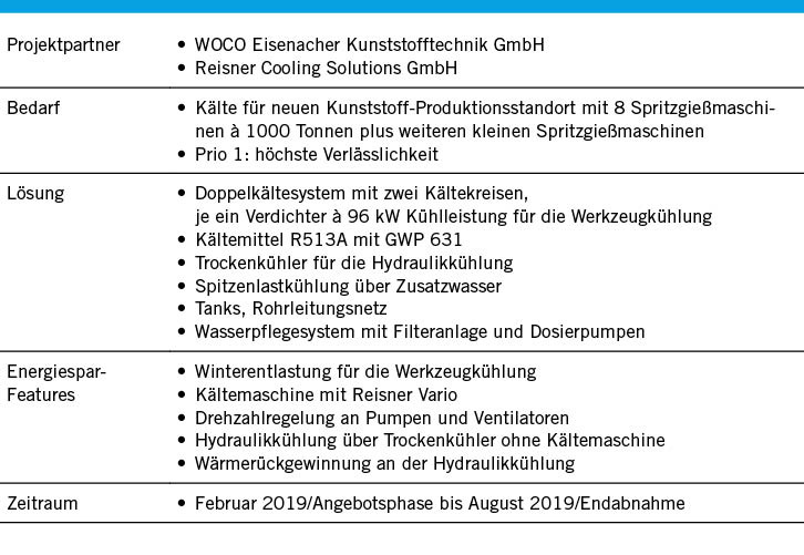 Entsprechend muss auch die Kältetechnik auf dem schmalen Grat zwischen zukunftssicherer Leistung und Überdimensionierung balancieren. Das Konzept dazu haben WOCO Eisenacher Kunststofftechnik und Reisner während der Angebotsphase gemeinsam entwickelt. Dabei hat Reisner die Auslegung mehrmals angepasst und den Kunden zu jedem Schritt ausführlich beraten. Das brachte Stützer und das Team wirklich voran: „Reisner hat ein besonderes Verständnis für unsere Situation bewiesen und kreative Ideen eingebracht. Unser Ansprechpartner, Vertriebsleiter Günter Sareyko, hat genau aufgezeigt, welche Folgen jede einzelne Entscheidung haben würde. Die nötigen Fakten bekamen wir immer sehr schnell. So konnten wir uns in allen Punkten bestens informiert festlegen.“