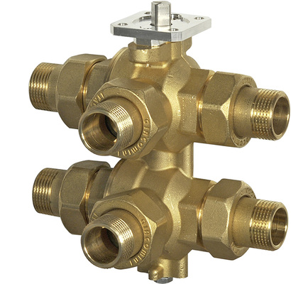 Da nun nur noch ein einziges Ventil für die Kontrolle der beiden Energiequellen zuständig ist, entfällt darüber hinaus die Notwendigkeit, das Öffnen und Schließen mehrerer Ventile exakt synchronisieren zu müssen. Das Umschalten zwischen den beiden Energiequellen ist bei den Positionen 0° und 90° möglich, das Schließen der Zufuhr beider Versorgungsquellen bei 45°. So kann bei Klimadeckensystemen der Wechsel von Heizen und Kühlen leicht vorgenommen werden, unabhängig von der Klimadeckenzone und zu jeder Tageszeit. Außerdem erhöht sich die Betriebssicherheit, da das Absperrelement ein gleichzeitiges Heizen und Kühlen verhindert.