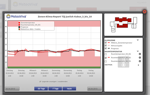 Noch einen deutlichen Schritt weiter geht die Betriebsoptimierung von MeteoViva Climate. Neben den meteorologischen Daten (Außentemperatur, Sonneneinstrahlung, Windgeschwindigkeit und Windrichtung sowie Luftfeuchte) werden weitere wesentliche Einflussfaktoren auf das Raumklima vom System erfasst und aufeinander abgestimmt. Dazu gehören das physikalisch-thermodynamische Verhalten der jeweiligen Gebäudezone, der Einfluss der Sonneneinstrahlung auf die Fensterflächen, die Charakteristik der konkreten Anlagentechnik sowie die Nutzung und Auslastung des Gebäudes.