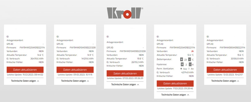 Darüber hinaus ist jede Anlage mit einem WLAN- und SIM-Karten-Router ausgestattet. Dieser ermöglicht zum einen die flexible Anpassung der Wunschtemperatur in einem Umkreis von einigen Metern, indem mit dem eigenen Smartphone einfach auf die Kroll-Webanwendung zugegriffen wird. Zum anderen können die Geräte und Daten mittels SIM-Karte aus der Ferne eingestellt sowie überwacht werden. Eine aufwändige Einarbeitung in die Steuerung ist somit nicht notwendig. ■