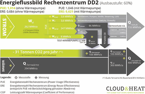 Das Start-up Cloud & Heat hat in einem Rechenzentrum in Dresden nun den weltweit niedrigsten Energieverbrauch realisieren können und den Bestwert von Google um über 40 Prozent unterboten. Die aktuellen Messergebnisse in unserem Rechenzentrum in der Wallotstraße in Dresden unterbieten die Energiewerte der modernsten und effizientesten Serveranlagen deutlich. Auch die von Google und Facebook“, berichtet Nicolas Röhrs, Geschäftsführer von Cloud & Heat. Referenzwerte bei den Messverfahren sind der Power Usage Effectiveness-Faktor, kurz PUE, und der Energy Reuse Effectiveness-Kennwert, kurz ERE. Wir haben jetzt einen sensationellen PUE von 1,014 1 und einen ERE von 0,62 2 bezogen auf ein Jahr erreicht. Das ist weltweit der niedrigste gemessene Wert. Diesen Wert erreichen wir nicht etwa im kühlen Skandinavien oder Alaska, sondern in unserem Rechenzentrum in Dresden in Deutschland – und das mit einer gegenwärtigen Ausbaustufe von 60 Prozent.“