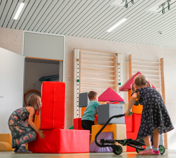 Neben den sechs Gruppenräumen gibt es kleine Küchen auf beiden Stockwerken, Therapie- und Schlafräume, Spielzimmer, Büros, Besprechungs- und Personalräume. Der multifunktionale Sportraum im Erdgeschoss ist über einen eigenen Eingang zugänglich und erlaubt dadurch eine flexible Nutzung für externe Teilnehmer auch nach Schließung des Kindergartens.