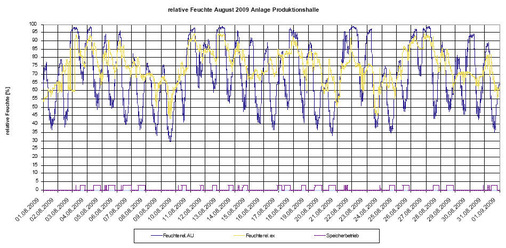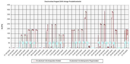 Vom Spätsommer 2008 bis Frühjahr 2009 wurden umfangreiche Messreihen aufgenommen, ausgewertet und anlagen- sowie regelungstechnische Optimierungen vorgenommen. Seit Juni 2009 konnte der in der Entwurfsplanung gewünschte Zustand der RLT-Anlage weitestgehend realisiert werden. Es folgte eine stetige monatliche Auswertung der am Standort erfassten Messdaten. Beispielhaft sind in Bild 5 die relative Luftfeuchte und in Bild 6 der Druckverlust des Schotterspeichersystems dargestellt.