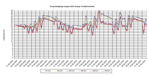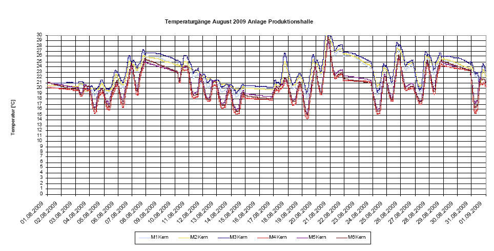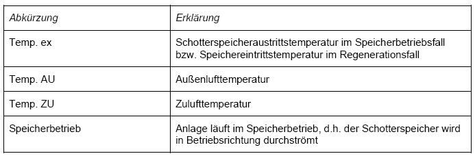 Die Messwertaufnahme der Temperatur erfolgt kontinuierlich, unabhängig von der Betriebsart des Schotterspeichers bzw. der Gasamtanlage. Die in der Legende benannten Abkürzungen stehen für die in Tabelle 2 näher bezeichneten Temperaturen.