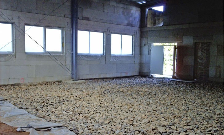Die Anlage ist für einen Nennvolumenstrom von 30000 m³/h ausgelegt. Das dafür dimensionierte Speichervolumen hat eine quaderförmige Kubatur mit den Abmessungen 2,5 x 10 x 6,5 m (H x B x L). Als Gesteinsfüllung fand Metagrauwacke mit einer Kornverteilung 45/150 Verwendung. Diese wird von der benötigten RLT-Außenluft direkt durchströmt. Die Regeneration des Speichers erfolgt neben dem erdreichseitigen Wärmetransport mithilfe von durchströmender Außenluft. Der Speicherkörper wurde unterhalb der Bodenplatte der neu zu bauenden Produktionshalle eingebaut. Er ist weder thermisch noch hermetisch gegen das umschließende Erdreich abgedichtet. Zur stofflichen Trennung des Systems wurde der Gesamtkörper mit Geotextil umschlossen. Die Anbindung an das Luftleitungssystem erfolgt über monolithisch hergestellte Schächte. Bild 1 zeigt den oberen Abschluss des Speichers vor dem Einbau des thermisch entkoppelten Fußbodenaufbaus, Bild 2 das technologische Verfahrensschema.