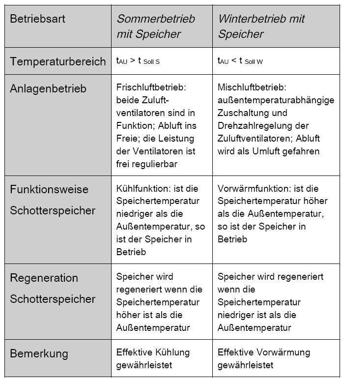Zuluftanlage I + II mit 100 Prozent Volumenstrom über Schotterspeicher am Tag, Nachtaufladung des Speichers mit direkter Nachtkühlung der Hallen.