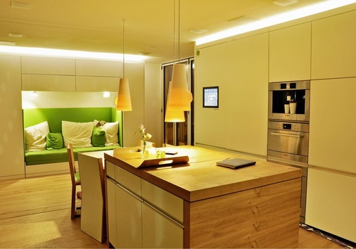 In Übereinstimmung mit geltenden Passivhausstandards verfügt das Wohnhaus über eine hoch wärmedämmende, luftdichte Gebäudehülle. Auf diese Weise werden Wärmeverluste an die Umgebung oder Wärmelasten aus der Umgebung möglichst gering gehalten, wodurch sich der Energiebedarf im Haus deutlich reduziert. Der Wandaufbau verfügt über einen Wärmedurchgangskoeffizient (U-Wert) von weniger als 0,1 W/(m 2 K) und besteht aus einer Holzständerkonstruktion mit außenliegenden 46 mm dicken Vakuumisolationspaneelen (VIP), die sich durch eine besonders hohe Dämmleistung auszeichnen. Bei den raumhohen Fensterelementen kam spezielles 3-Scheiben-Wärmeschutzglas zum Einsatz. Der U-Wert beträgt hier 0,58 W/(m 2 K), der Energiedurchlassgrad (g-Wert) liegt bei 0,35. Der notwendige Luftaustausch zur Einhaltung der vorgegebenen Grenze für den CO 2 -Gehalt von maximal 800 ppm erfolgt über eine kontrollierte Wohnraumlüftung mit Wärmerückgewinnung.