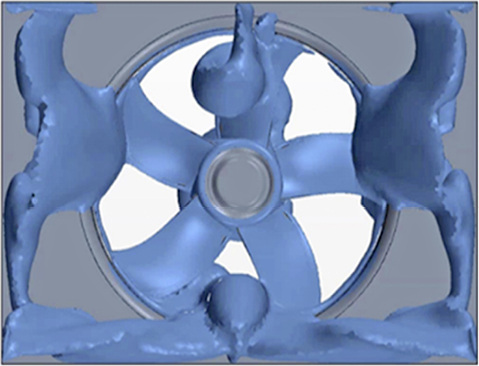 Die Auswertungen lassen bei einem typischen Axialventilator zwei dominante Geräuschquellen erkennen: die Kopfspaltströmung zwischen Schaufel und Wandring sowie die sogenannten Zuströmturbulenzen (Bild 3) . Am Kopfspalt kommt es durch den Druckunterschied zwischen der Druck- und Saugseite zur Überströmung der Ventilatorschaufel an der Schaufelspitze. Die Strömung interagiert dort mit den vorhandenen Kanten, also der Schaufeloberfläche und der umgebenden Gehäusewand. Es bilden sich Wirbel, die bei der Ablösung den Schallpegel um bis zu 10 dB erhöhen können.
