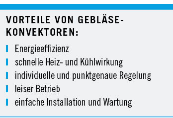Das schnelle Ansprechverhalten von Gebläsekonvektoren im Vergleich zu deutlich trägeren Flächenkühlsystemen wurde bereits erwähnt. Ein weiterer Vorteil ist der Luftaustausch durch die Zufuhr von Frischluft, was sich insbesondere in Gebäuden mit hohem Belegungsgrad positiv auf Wohlbefinden und Produktivität der Besucher und Beschäftigten auswirkt. Zudem ermöglichen Gebläsekonvektoren eine flexiblere Raumaufteilung als Flächenheiz- und Flächenkühlsysteme, sodass sich beispielsweise größere Büroflächen je nach Bedarf in kleinere Einheiten mit individuell regelbarem Klima gliedern lassen. Und auch hier kommt der leise Betrieb der Geräte zum Tragen.