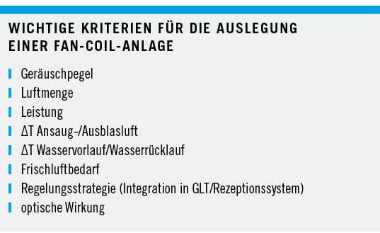 Dies ist möglich, da Gebläsekonvektoren – anders als etwa Flächenheiz- oder Flächenkühlsysteme (FHS/FKS) – eine schnelle Anpassung an Witterungsänderungen erlauben, insbesondere in der Übergangszeit ein nicht zu vernachlässigender Vorteil. So sorgen sie nicht nur im Hotelzimmer für Komfort und Behaglichkeit; auch in der Lobby, an der Bar oder im Frühstücksraum schaffen sie jederzeit ein angenehmes Klima.