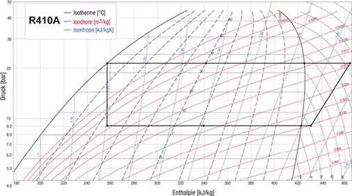 Damit wurde das log p, h-Diagramm in Bild 2 erstellt und die entsprechenden Drücke und Enthalpien ermittelt. Die errechnete Überhitzung von 6,5 K soll sicherstellen, dass kein Flüssigkeitsanteil in den Kompressor gelangt und Beschädigungen verursachen kann.