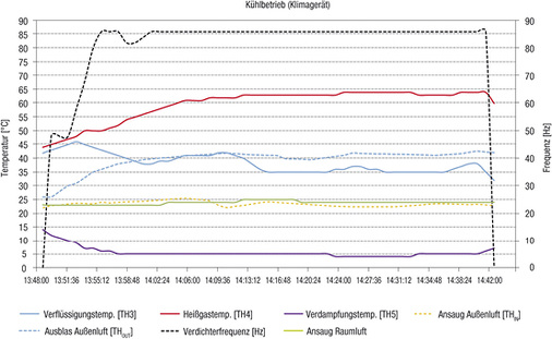 Die Messung im Kühlbetrieb erfolgte mit angeschlossenem Klima-Innengerät (PCA-RP71KA) bei einer Raumtemperatur von 24 bis 25 °C. Als Sollwert für die Raumtemperatur wurde 20 °C eingestellt. Die Außenlufttemperatur betrug 23 bis 25 °C. Bereits nach ca. 7 min erreicht der Kompressor seine maximale Frequenz von 86 Hz. Nach ca. 20 min erreichen die Temperaturen einen stationären Zustand (Tabelle 3). Dies veranschaulicht die schnelle Anpassung von Klima- im Vergleich zu wassergeführten Systemen. Die Temperaturspreizung am Split-Außengerät ist im Kühl-betrieb mit 19 K mehr als doppelt so groß wie im Heizbetrieb. Aufgrund der relativ niedrigen Außentemperatur ist lediglich eine Heißgastemperatur von 64 °C notwendig. Als Referenzzeitpunkt zur Ermittlung der Enthalpien wurde 14:30 Uhr gewählt. Das Wärmepumpen-Innengerät blieb während der gesamten Messdauer aus-geschaltet.