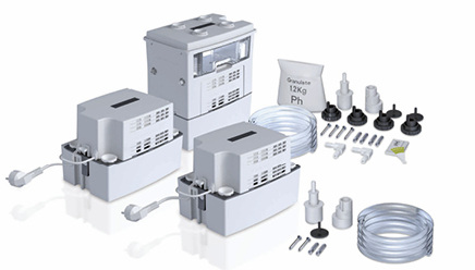 Je nach Anwendungsbereich stellt Kondensat besondere Anforderungen an die Entwässerung. Dafür eignen sich installationsfertige Anlagen wie die Modelle der Baureihe Conlift von Grundfos. Sie fördern Kondensatwasser aus Klima- bzw. Kälteanlagen und Ventilatorkonvektoren, sind aber auch auf die speziellen Anforderungen von aggressivem Kondensat aus Öl- und Gasfeuerungsanlagen mit Brennwerttechnik ausgelegt. Mit vier groß dimensionierten Zuläufen und einer um 180 Grad drehbaren Motoreinheit lässt sich die Anlage an nahezu jede Einbausituation anpassen. Der Spritzwasserschutz (IP24) sichert die Anlage gegen Kurzschlüsse und die Einleitung in den Tank ist so angelegt, dass weder Gase aus dem Kessel in das Gerät gelangen noch eingeschwemmte Sedimente den Schwimmer blockieren können. Insgesamt ist der Motorbereich gegen aufsteigenden Dampf aus dem Tank geschützt und hermetisch abgeschlossen. Praktisch für den Servicetechniker ist ein Handtaster, mit dem sich mit oder ohne Wasserfüllung ein Schnelltest der Anlage durchführen lässt. Der Geräuschpegel der Anlage liegt bei weniger als 47 dB (A) im Betrieb. Die Baureihe besteht aus drei Modellen, die sich auch nachträglich mit Zusatzmodulen erweitern lassen. Das Basismodell Conlift1 bietet bereits einen vollen Funktionsumfang, das Modell Conlift2 zusätzlich eine Alarmplatine für akustischen Hochwasseralarm. Die Ausführung Conlift2 pH+ ist mit einer nachfüllbaren Neutralisationseinheit ausgestattet, die wahlweise auf oder neben der Anlage montiert werden kann und (etwa bei Brennwertanlagen) aggressives Kondensat auf einen höheren, vorgeschriebenen pH-Wert anhebt.