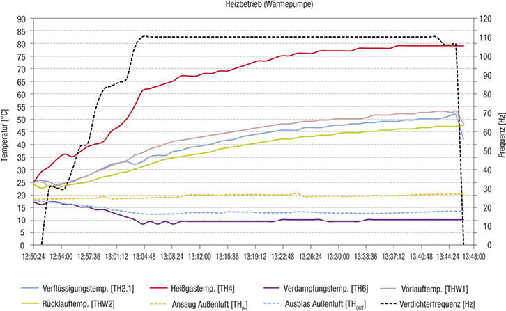 Für die Messung wurde ein Warmwasserspeicher als Wärmesenke genutzt und von 20 °C bis ca. 55 °C aufgeheizt. Als Sollwert wurde eine Wasservorlauftemperatur von 60 °C eingestellt. Die Außenlufttemperatur betrug 19,5 °C. Der Verlauf dieser Aufheizung wurde nach ca. 50 min beendet, da der Sollwert nahezu erreicht war und der Kompressor seine Leistung reduzierte. Das Klima-Innengerät blieb die gesamte Messdauer über ausgeschaltet.