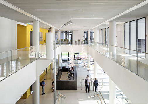 Dementsprechend erfolgt die Temperierung des L-förmigen Gebäudes mit einer Bruttogeschossfläche von ca. 24 000 m 2 über eine aufeinander abgestimmte Kombination von Bauteilaktivierung und Heiz- und Kühldecken. Die Grundlast deckt dabei ganzjährig die in den Kernbereichen des Objekts auf einer Fläche von 3600 m 2 installierte Bauteilaktivierung Batiso ab. Das System wurde dafür direkt in die massiven Betondecken eingegossen und nutzt so die thermische Speicherfähigkeit des Gebäudes.