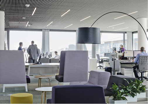 In den Außenzonen der Bürobereiche heizen oder kühlen dann zusätzlich 3500 m 2 freihängende Metalldeckensegel Varicool Spectra individuell und nach Bedarf. Für eine ansprechende Deckenoptik wurden dabei die Heiz- und Kühlregister mittels Magnettechnik befestigt. Durch deren hohe Stabilität konnten auch sehr große Elemente mit absolut planen Flächen realisiert werden. Gleichzeitig wirken die Deckensegel schallabsorbierend und reduzieren so die Nachhallzeiten gerade in den Großraumbüros deutlich.