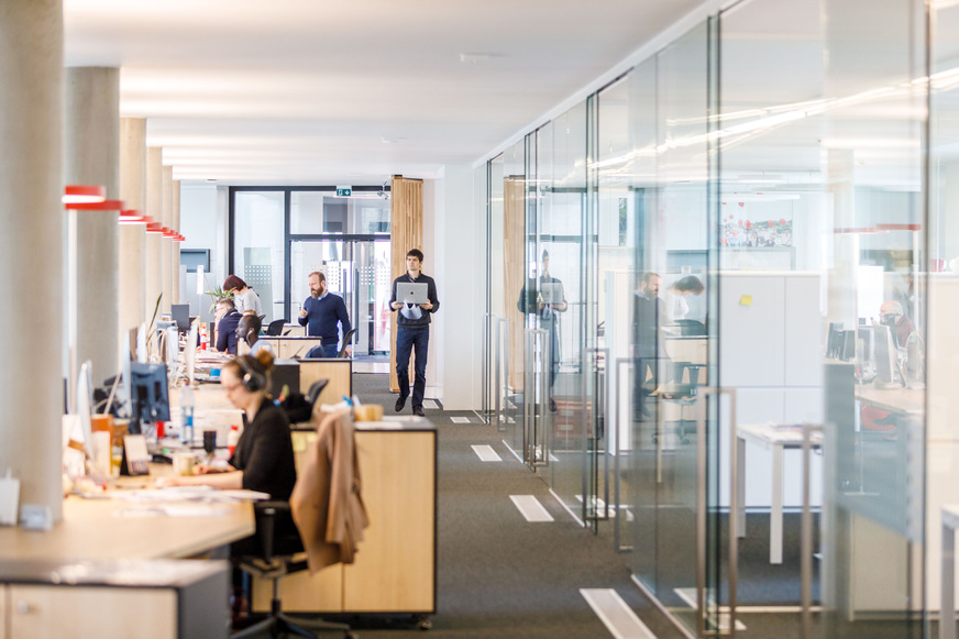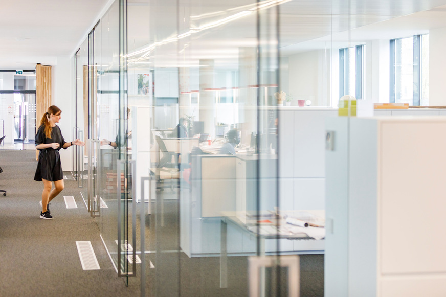 Auch die kompakten BS-Verteilerboxen sind im Zwischenboden untergebracht, was die Installation vereinfacht hat. In den wenigen Räumen ohne Zwischenboden, wie dem Drucker- und Kopierraum, sind Klima-Deckenkassetten angebracht.