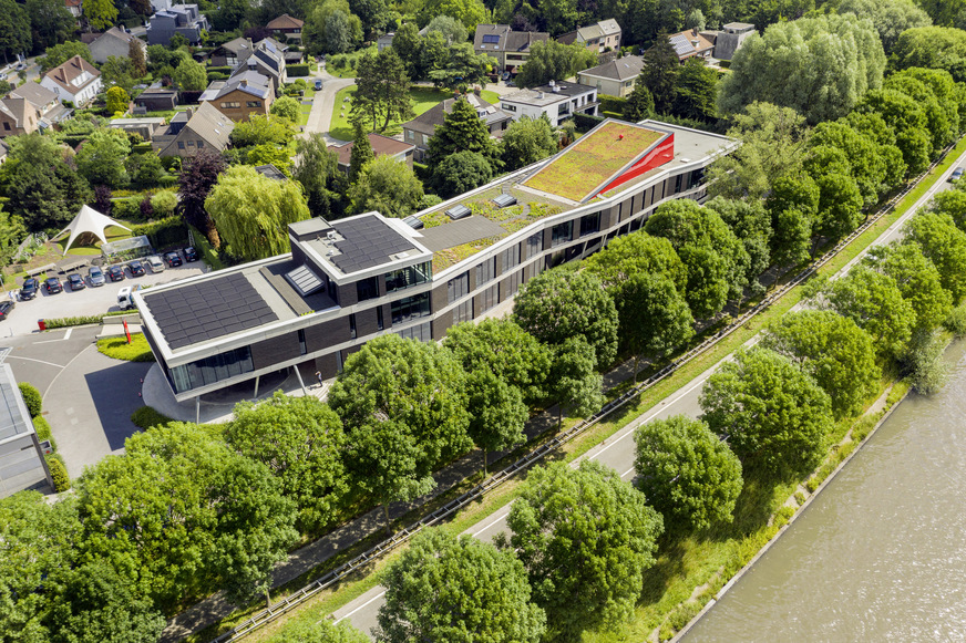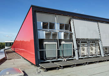 Die Außengeräte stehen unter einem Schutzdach auf dem begrünten Flachdach und sind zusätzlich mit Sonnensegeln gegen Überhitzung geschützt. Auf dem Dach befinden sich eine Terrasse, die Solaranlagen, ein Regenwassermanagement und Fenster, die Tageslicht spenden. Durch die Bepflanzung des Daches werden der Wärmeverlust im Winter und der Sonnenenergieeintrag im Sommer reduziert. Solarnutzung und die gleichzeitige Dachbegrünung wurden bislang überwiegend als konkurrierende Maßnahmen angesehen, sie lassen sich aber miteinander verbinden, denn aus der Kombination ergeben sich Synergieeffekte: Begrünte Dächer bewirken eine reduzierte Umgebungstemperatur, was zu einer Erhöhung des Wirkungsgrades der Solarzellen führt. Gleichzeitig hat das auf dem Gründach verdunstende Regenwasser einen kühlenden Effekt auf das Gebäude.