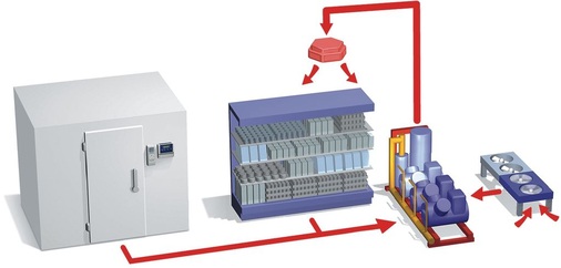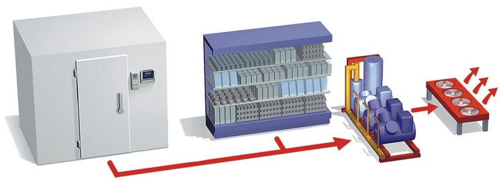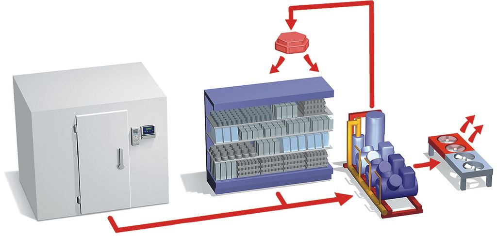 Sollten die vorhandenen Wärmeströme zur Gebäudeheizung für den extremen Heizfall nicht ausreichen, kann durch eine Wärmeplus-Schaltung (ähnlich einer Wärmepumpenfunktion/Bild 4) mit der vorhandenen Gewerbekältetechnik zusätzlich Heizwärme aus der Umgebung bereitgestellt werden. Die Größe dieser Funktion ist abhängig vom Aufbau des Supermarktes (Beleuchtung, Lüftungsanlage, Kältebedarf, Gebäudehülle, Heizbedarf, Öffnungszeiten, Umsätze u. v. a.).