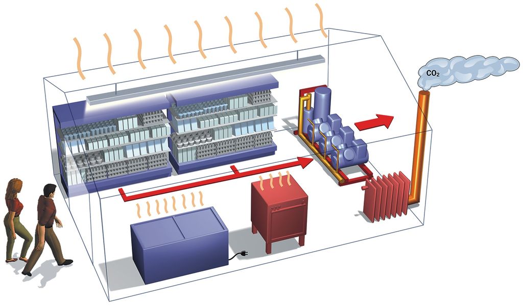 Weitere Wärmeströme (Bild 3) innerhalb eines Supermarktes können bei der Gesamtbetrachtung so weit führen, dass eine üblicherweise installierte, konventionelle Heizungsanlage mit Gas- oder Ölbefeuerung entfallen kann. Die in der Kooperation der Firmen GTM, Teko und Wurm gemachten Erfahrungen bei der Umsetzung von mittlerweile mehr als 20 Objekten zeigt, dass die üblichen Heizungsanlagen für die Anwendung erheblich überdimensioniert sind. Dies liegt an diesen unberücksichtigten, internen Wärmequellen. Ein Supermarkt ist nie bewohnt, d. h. der Heizbedarf ist nur während der Öffnungszeiten relevant und genau dann sind die genannten internen Wärmeströme groß.