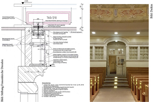 Für die Warmlufteinbringung ist neben zwei Zuluftgittern im Altarbereich im runden Kirchenraum ein 68 m langes Band mit achtreihigen Kugeldüsen unterhalb der Betstubendecke in einer Höhe von 4 m vorhanden, sodass die Warmluft gleichmäßig und zugfrei eingeblasen wird (Bild 4) . Die Abluft wird großflächig zentral in der Chorschranke vor dem Altarraum und unter den seitlichen Treppenstufen abgesaugt. Außenwandflächen sind ab dem Betstubengeschoss (1. OG) vorhanden, einschließlich großer Fensterflächen.