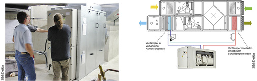 Das Konzept basiert auf dem Einsatz von Direktverdampfern mit Kälteerzeugung in der Zuluft und Kondensator in der Fortluft. Dabei handelt es sich um eine geschlossene Kälteanlage, bestehend aus Kälteerzeuger, Regelventil, Direktverdampfer, Kondensator und Rohrleitungen. Die Wärmeübertrager sind im Luftstrom der vorhandenen RLT-Geräte untergebracht (Bild 5) . Als Kältemittel wird R134a verwendet. Für die Außenluft- und Fortluftanbindung der RLT-Geräte wurden gestalterisch anspruchsvolle Ansaug- und Fortluftbauwerke im Neumarktbereich errichtet. Für die Nachrüstung der Kälte-/Klimaanlage konnten sie ohne Änderung weiter genutzt werden.