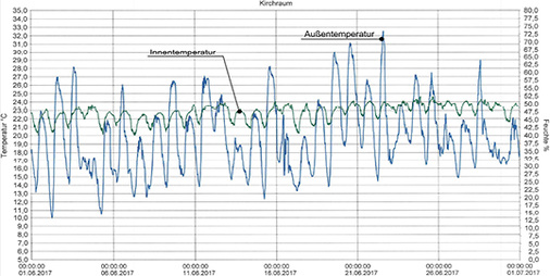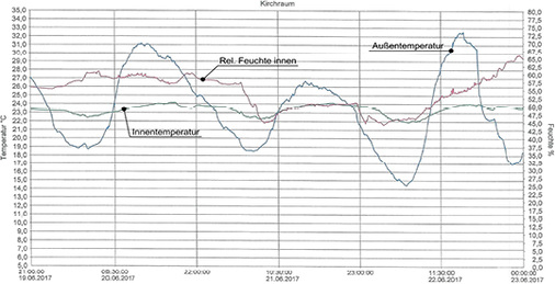 Am 22. Juni 2017 wurde die Innentemperatur im Erdgeschoss des Kirchenraumes bei einer Außentemperatur von 32,5 °C mit 22 bis 24 °C nahezu konstant geregelt (Bild 10) .
