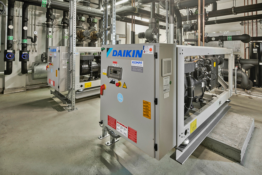 Für die Bereitstellung der notwendigen Kälte sorgen zwei neue Kaltwassersätze gemeinsam mit den weiteren bereits 2002 installierten Anlagen von ihrem Standort in der Technikzentrale aus. Auch die neuen Anlagen sind dank ihrer kompakten, modularen Ausführung perfekt für die Innenaufstellung geeignet.