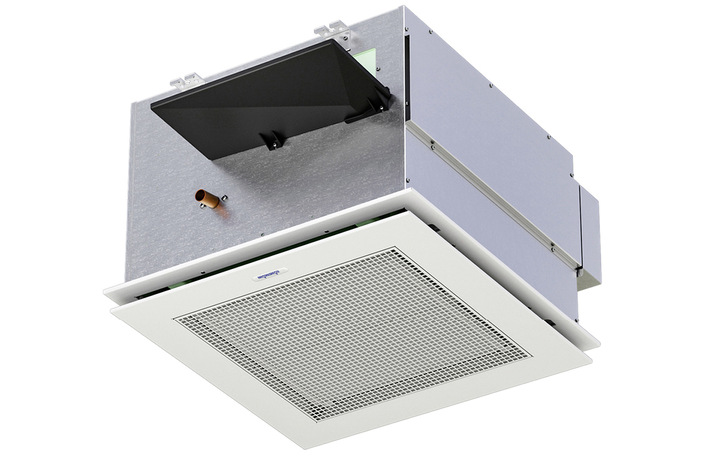 Mit dem Fan Coil KaCool D HY bringt Kampmann eine nach VDI 6022 vom Hygieneinstitut HyBeta zertifizierte Hygienedeckenkassette auf den Markt, die für Räume mit abgehangenen Decken und erhöhten Hygieneanforderungen geeignet ist. Der KaCool D HY ist mit einem Wärmeübertrager aus Kupfer-Rundrohren mit Aluminiumlamellen ausgestattet, geeignet für Pumpenwarmwasser (PWW) und Pumpenkaltwasser (PKW). Bei einer Kühlleistung von 1,1 bis 4,9 kW und einer Heizleistung von 2,0 bis 11,5 kW arbeitet das Gerät mit einem Luftvolumenstrom zwischen 160 bis 705 m³/ h. Ein stufenlos regelnder EC-Wechselstrom Radialventilator mit 0-10 Volt - Eingang verfügt über wartungsfrei gelagerte drehende Teile und einen Schallleistungspegel von 34 - 62 dB (A).