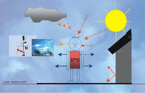 Mit steigenden Außentemperaturen sorgt die Wärmeregulation der Haut über vermehrtes Schwitzen für Verdunstungskälte. Reicht diese Thermoregulation nicht aus, öffnen sich die Blutgefäße, um die Wärme nach außen besser abzuleiten, der Blutdruck sinkt, die Pumpleistung des Herzen steigt. Spätestens bei dauerhaft über 40 °C Körperinnentemperatur kommt es zu lebensbedrohlichen Zuständen. Die Wärmebilanz ist nachhaltig gestört, die Wärmeableitung versagt. Nach dem Jahrhundertsommer 2003 mit europaweit 35000 Menschen, die den tropischen Temperaturen zum Opfer fielen, richtete der Deutsche Wetterdienst (DWD) im Sommer 2005 einen Hitzewarndienst ein erstmals nach gefühlter Temperatur ( http://www.dwd.de und VDI-Richtlinie 3787 Blatt 2).