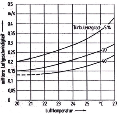 Das Diagramm zeigt eine der wichtigsten Erkenntnisse nach Fanger: Ein Luftzug von weniger als 10 cm/s genügt für das Absinken der gefühlten Temperatur um 4 K.