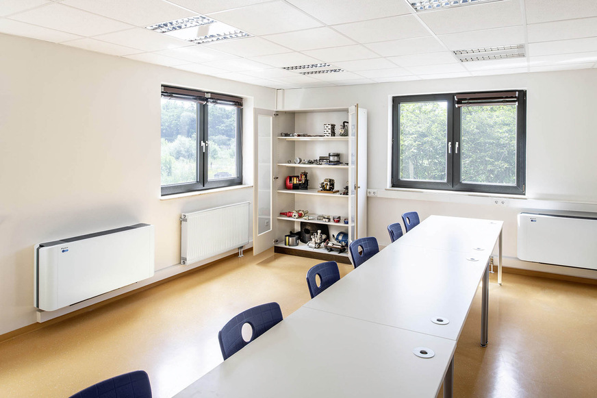Die Klimatisierung des Mensabereichs erfolgt über drei Roundflow Kassettengeräte von Daikin, die in die abgehängte Decke integriert wurden und durch ihre 360°-Luftblasrichtung optimale Effizienz und Kühlkomfort bei flüsterleisem Betrieb liefern. Ein Fußbodensensor ermittelt die durchschnittliche Fußbodentemperatur und sorgt für eine gleichmäßige Temperaturverteilung zwischen Decke und Fußboden. Durch eine optimierte Luftverteilung lassen sich auch unregelmäßig gestaltete Räume oder kleine Nachbarräume belüften. Auch zwei der Schulungsräume sowie Lehrerzimmer wurden mit Unterdeckengeräten oder Truhengeräten ausgestattet.