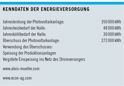 Die ebenfalls 2800 m 2 große Photovoltaikanlage kann dabei nicht nur ganzjährig die Heizung und Kühlung der Halle übernehmen, sondern liefert auch noch den Strom für den Betrieb der Produktionsmaschinen. Die Energiekosten und der CO 2 -Ausstoß sinken damit auf Null, außerhalb der Produktionszeiten wird die gewonnene Energie über ein 8000 m langes Rohrsystem in einen großen Pufferspeicher im Betonkern der Halle gespeichert oder ins allgemeine Stromnetz eingespeist und vergütet.