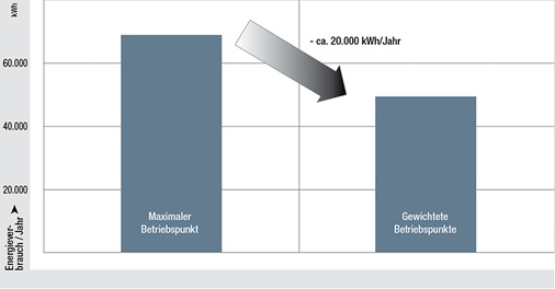 Die Berechnung des Energieverbrauchs erfolgt durch die gewichteten Betriebspunkte wesentlich genauer. Bild 3 zeigt beispielsweise die Energieverbrauchsberechnung eines FanGrids mit vier Ventilatoren der Baureihe RadiPac. Der linke Balken zeigt den Energieverbrauch, errechnet auf Basis des Maximalarbeitspunktes (etwa 70 000 kWh). Der rechte Balken (etwa 50 000 kWh) zeigt den tatsächlichen Energieverbrauch des FanGrids pro Jahr, errechnet anhand realistisch gewichteter Betriebspunkte.