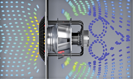 Diese Einsparpotenziale lassen sich durch den Einsatz von EC-Ventilatoren in FanGrids erreichen. Denn sie sind besonders effizient und können jederzeit auf den gewünschten Betriebspunkt geregelt werden. Dazu zählt der neue EC-Radialventilator RadiPac für Raumlufttechnik ( Bild 4 ). Er ist nicht nur bis zu 13 Prozent effizienter als sein Vorgänger, sondern auch um über 3 dB(A) leiser. Sein optimiertes Abströmverhalten sorgt für eine effektive Strömungsführung, auch bei geringem Platzangebot ( Bild 5 ). Setzt ein Rechenzentrumsbetreiber den neuen EC-Radialventilator in seinen FanGrids ein, ist ein effizienter Betrieb auf kleinem Bauraum möglich.
