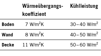Grundsätzlich können sowohl Boden, Wand als auch Decke für die Kühlung von Räumen genutzt werden. Zu bedenken ist jedoch, dass der Wärmeübergangskoeffi-zient und die Kühlleistung sehr unterschiedlich ausfallen. So eignet sich die Decke am besten für eine raumflächenintegrierte Kühlung, dann folgen Wand und Boden. Folgende Werte können bei der Nutzung der entsprechenden Flächen erreicht werden: