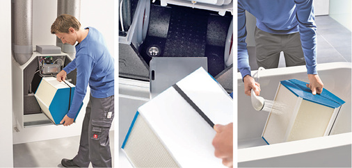 Die Enthalpieübertrager mit Polymer-Membran hingegen zeichnen sich diesbezüglich durch permanente Übertragungskennwerte aus, die dank der Wartungsfreundlichkeit (einfache Entnahme aus dem Lüftungsgerät und Reinigung mit Wasser) auch gegenüber dem Aufwand einer Rotorreinigung bei Rotationswärmeübertragern besticht (Bild 2) .