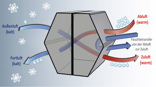 Der Enthalpieübertrager friert im Normalbetrieb unter den Bedingungen des im europäischen Raum meist verbreiteten kühl-gemäßigten Klimas nicht ein, da ein Großteil der Feuchtigkeit im Winter auf die Zuluft übertragen wird (Bild 4) . Die Applikation des Enthalpieübertragers in Lüftungsgeräten ermöglicht zudem für externe Frostschutzmaßnahmen Einsparungen hinsichtlich der Investitions- und Betriebskosten. Die Begründung liegt in der Absenkung der Frostschutzgrenze und eine daraus resultierende Erhöhung der nutzbaren Temperaturspanne für den Wärmerückgewinnungsprozess. Die Aktivierung des Frostschutzmodus erfolgt je nach gerätetypischer Steuerungskonfiguration bei Außenlufttemperaturen zwischen 5 °C und 10 °C. Eine allgemeingültige, quantitative Aussage zur Betriebskostenersparnis lässt sich schwer validieren. Je nach Art der Frostschutzmaßnahme (Sole-Erdwärmeübertrager oder Elektro-Defroster), den klimatischen Verhältnissen und den anlagenbedingten Betriebsparametern kann die aufzuwendende Hilfsenergie differieren. Damit ist die Behauptung, dass ein zusätzliches Heizregister als Vereisungsschutz systembedingt erforderlich wäre, als Halbwahrheit zu relativieren.